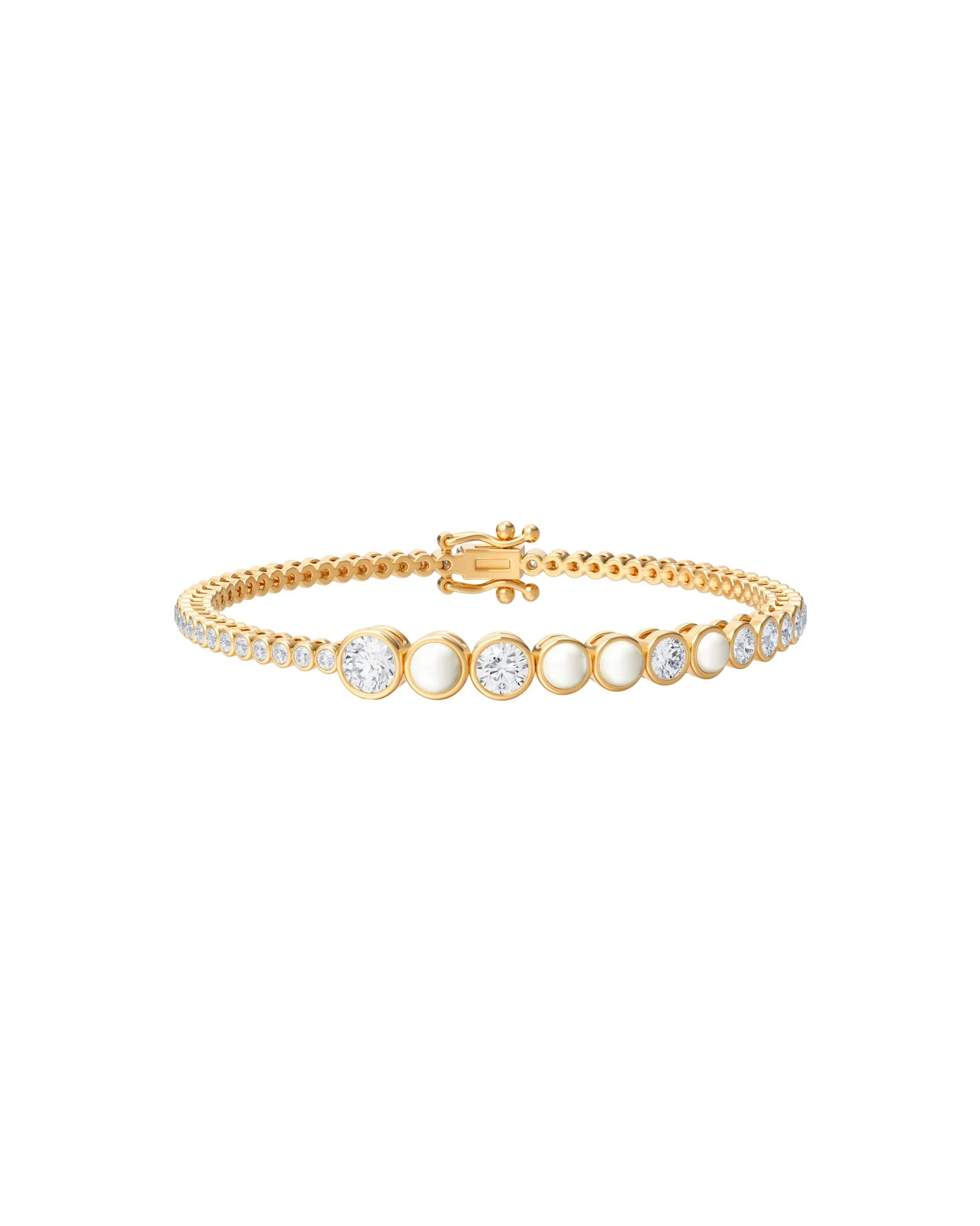 A timeless bracelet featuring graduated bezel-set diamonds accented with your choice of blue sapphires or pearls. Elegant and meaningful, it’s a modern heirloom designed to celebrate life’s most special moments.